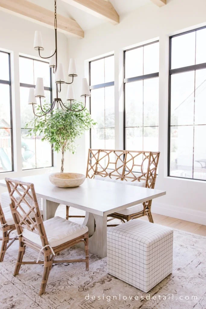 Just wanted to share a few recent photos of our dining room! When I designed our home plan I wanted the dining room to be the focal point of the whole house since it's one of the first spaces you see when you enter. The windows + beams are some of my favorite details ever that really make this home unique & fresh!