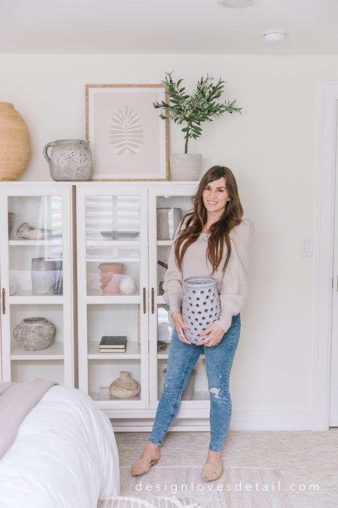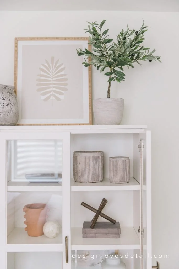 One of my top favorites is this versatile potted faux olive tree! I love the petite size because it fits anywhere. I also love that it comes in a cute pot, that's ready to display. Additionally, the greenery adds a fresh feeling to the space without the maintenance of a real plant. Another fave from The Home Depot is my concrete-look pitcher. It adds amazing texture and I love the artifact, aged feel it has. The oversized woven vase is a great decor accent as well, that brings in a natural element and wonderful scale. It looks beautiful on its own or filled with faux stems.