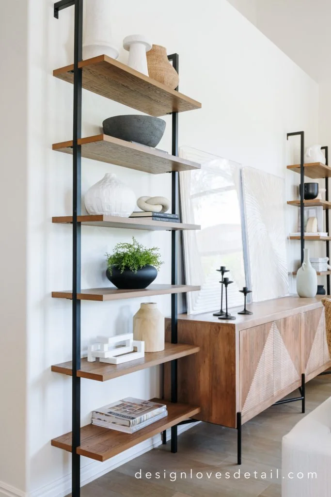 I think this room is officially my favorite!! I wanted to create a great focal point that you'd see right when you come in the front door. I wasn't able to fit custom built in's into the budget, but was so excited to find these Walmart shelves that attach to the wall for a custom look! I also found the amazing sideboard quite awhile back and knew it would be perfect for this room! It sold out right when I shared it on my IG stories, but I've linked it below & will keep an eye out for restock-- it's seriously incredible!!