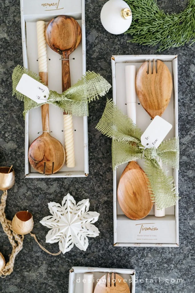 Neighbors/co-workers/friends/hostess gift-- I love gifts that are simple, beautiful & useful! Kitchen items are one of my favorite things to gift because they are used so frequently. These gorgeous wooden serving utensils I picked up from Tuesday Morning come in a box that's perfect for gifting-- just tie a ribbon & tag around to give it a festive feel! I got the adorable ribbon + tags from Tuesday Morning too. When you've got a large amount of people to give to such as neighbors or co-workers it's important to keep things easy to do + affordable. These gorgeous serving sets are just $9.99! And adding the ribbon & gift tag was a breeze!!