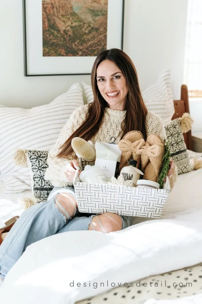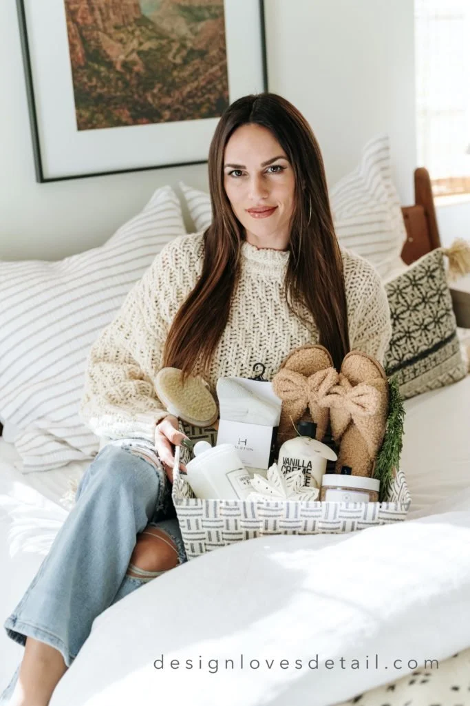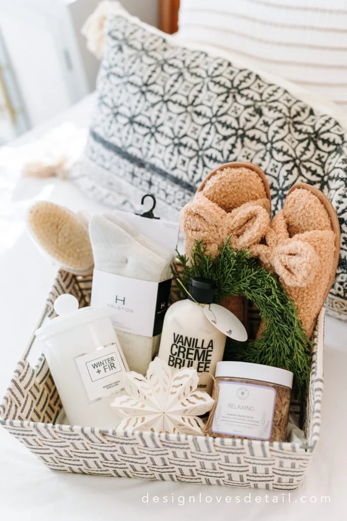 For friends/sisters/moms-- this spa gift basket I put together from Tuesday Morning finds is practical, pretty & posh! I love the cute woven bin that can be used to store these spa-like essentials in style. The cozy slippers, a holiday-scented candle, some incredible lotion, beautiful bath salts, back scrubber & wool socks make this a dreamy surprise for the women in your life who deserve some relaxation & time to de-stress this holiday season!