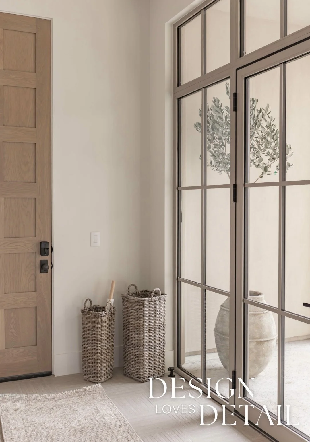 The stunning glass door with side panels is from Soniq windows + doors in color Weimeraner by Benjamin Moore. And the accent wall with trim is also painted in Weimeraner to tie in.