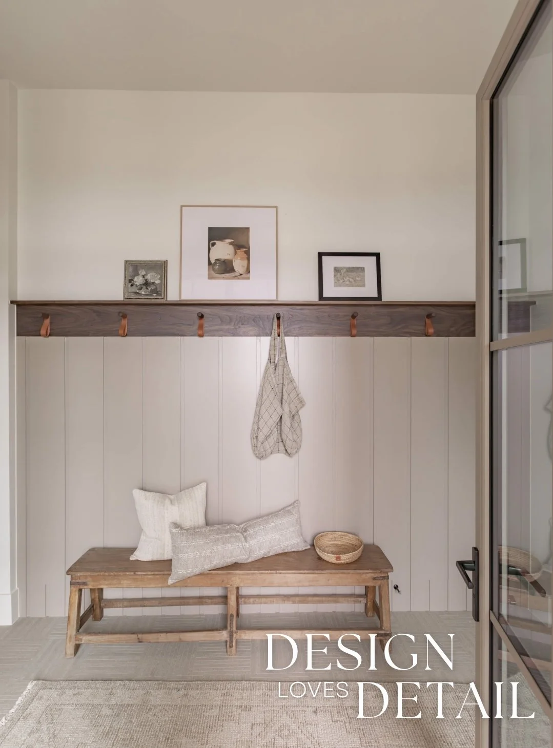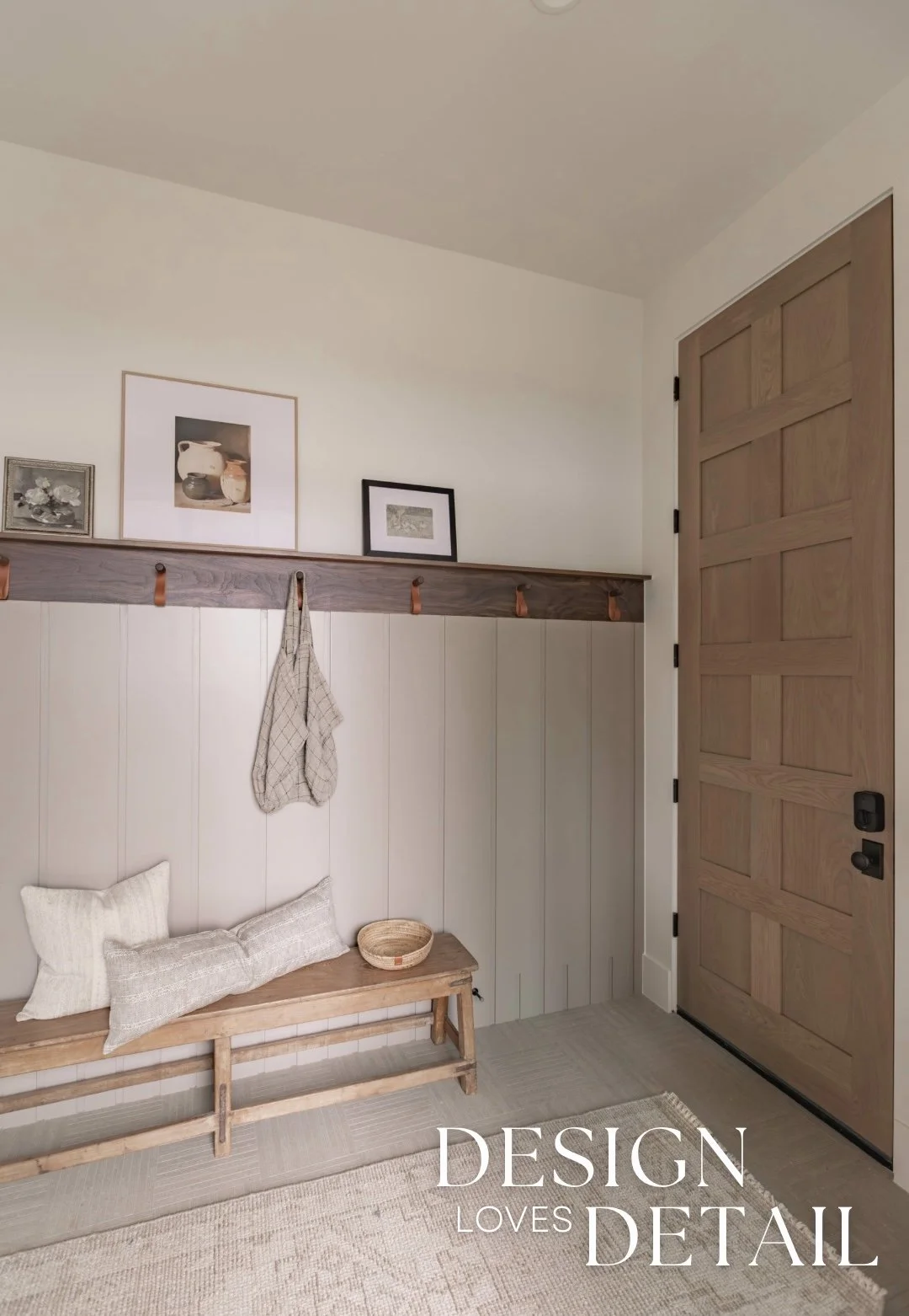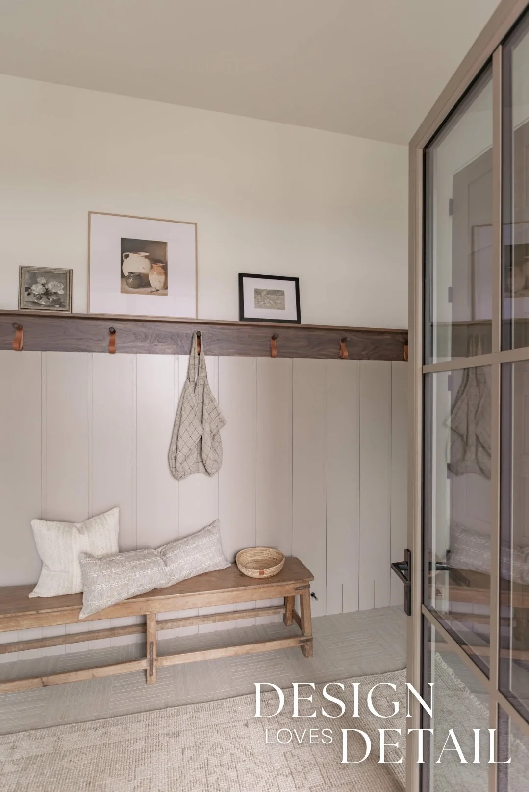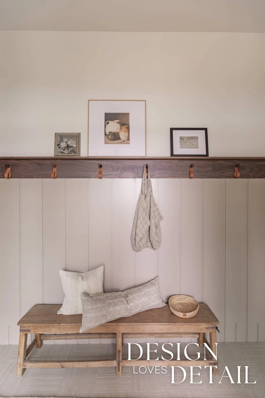 The hooks used on the walnut trim piece are actually an Amazon find— the leather detail adds another texture and create a sense of that layered, lived-in aesthetic. Denette found that cute linen bag to hang on the hook from a local shop and we layered artwork on the ledge for added character that can be swapped out seasonally or feature kids artwork or family photos to customize the space! I’ll link the awesome frames/mats that are a total steal.
