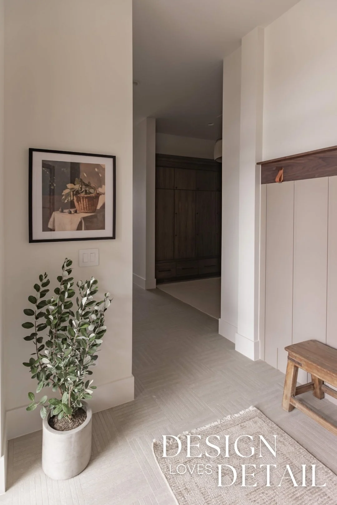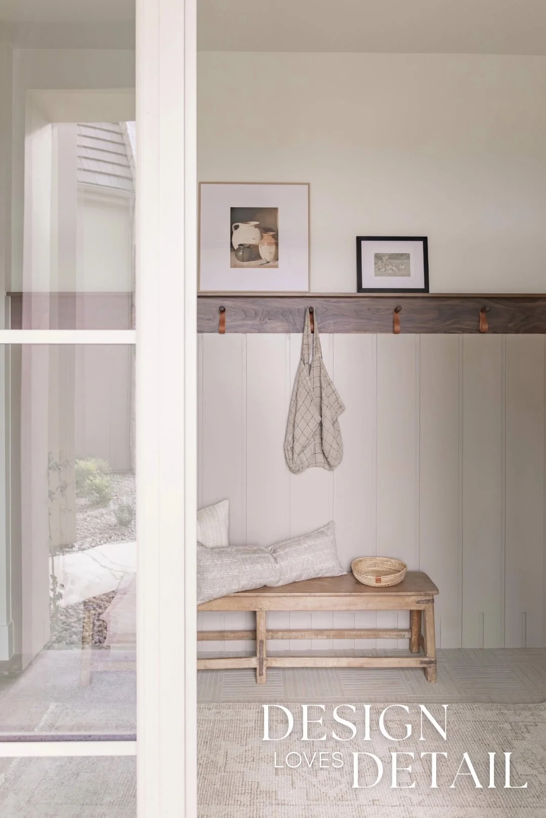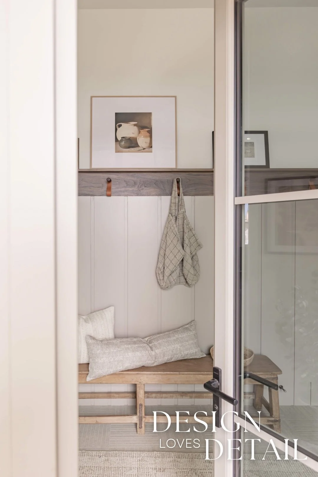 The hooks used on the walnut trim piece are actually an Amazon find— the leather detail adds another texture and create a sense of that layered, lived-in aesthetic. Denette found that cute linen bag to hang on the hook from a local shop and we layered artwork on the ledge for added character that can be swapped out seasonally or feature kids artwork or family photos to customize the space! I’ll link the awesome frames/mats that are a total steal.