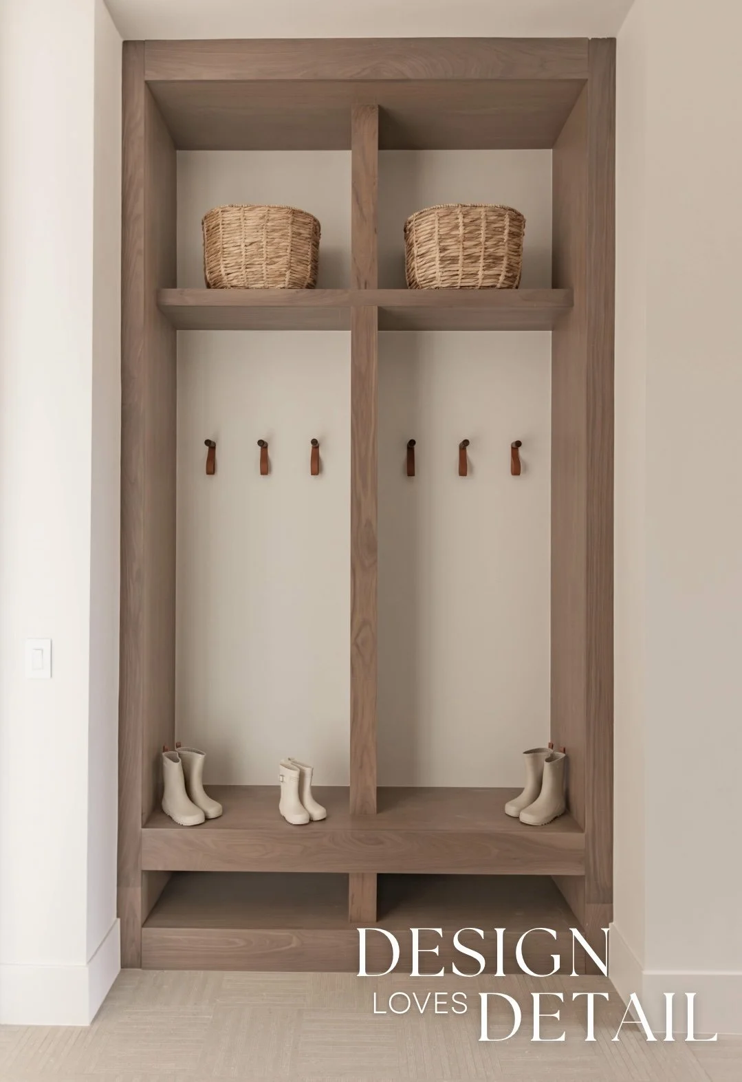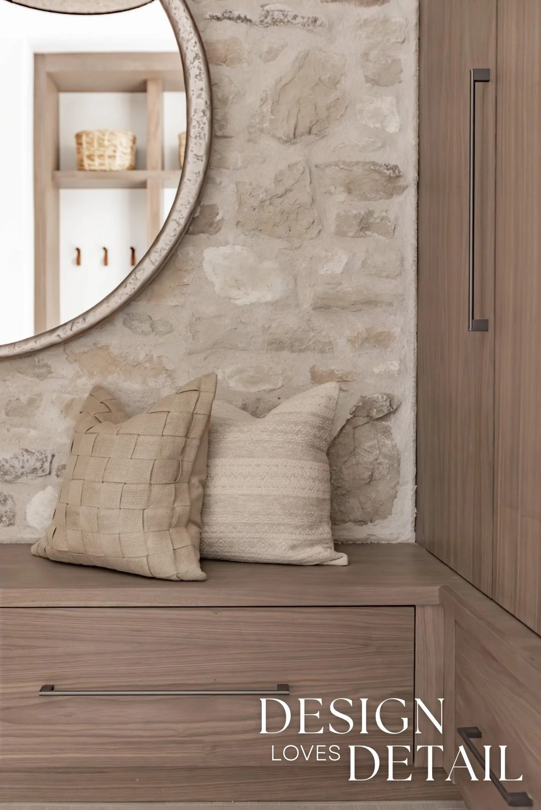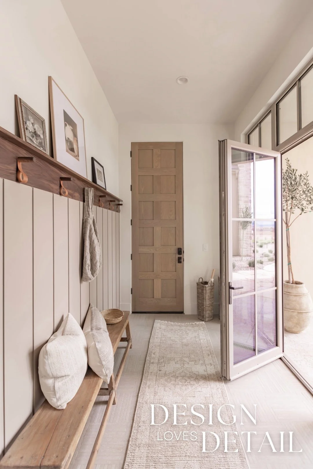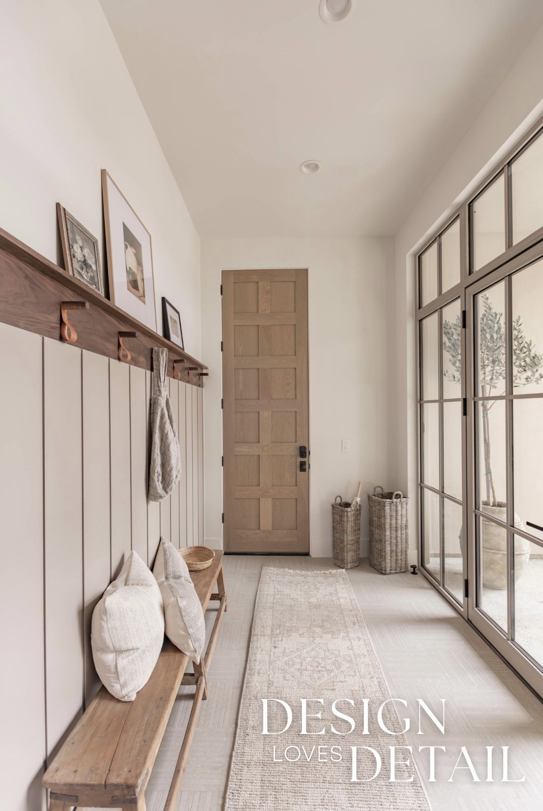 The hooks used on the walnut trim piece are actually an Amazon find— the leather detail adds another texture and create a sense of that layered, lived-in aesthetic. Denette found that cute linen bag to hang on the hook from a local shop and we layered artwork on the ledge for added character that can be swapped out seasonally or feature kids artwork or family photos to customize the space! I’ll link the awesome frames/mats that are a total steal.