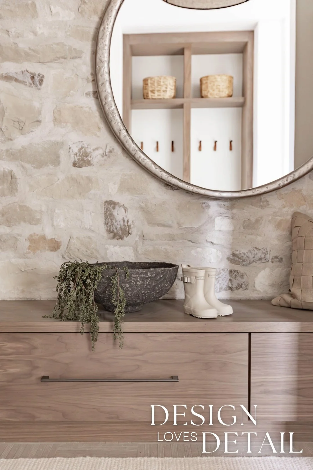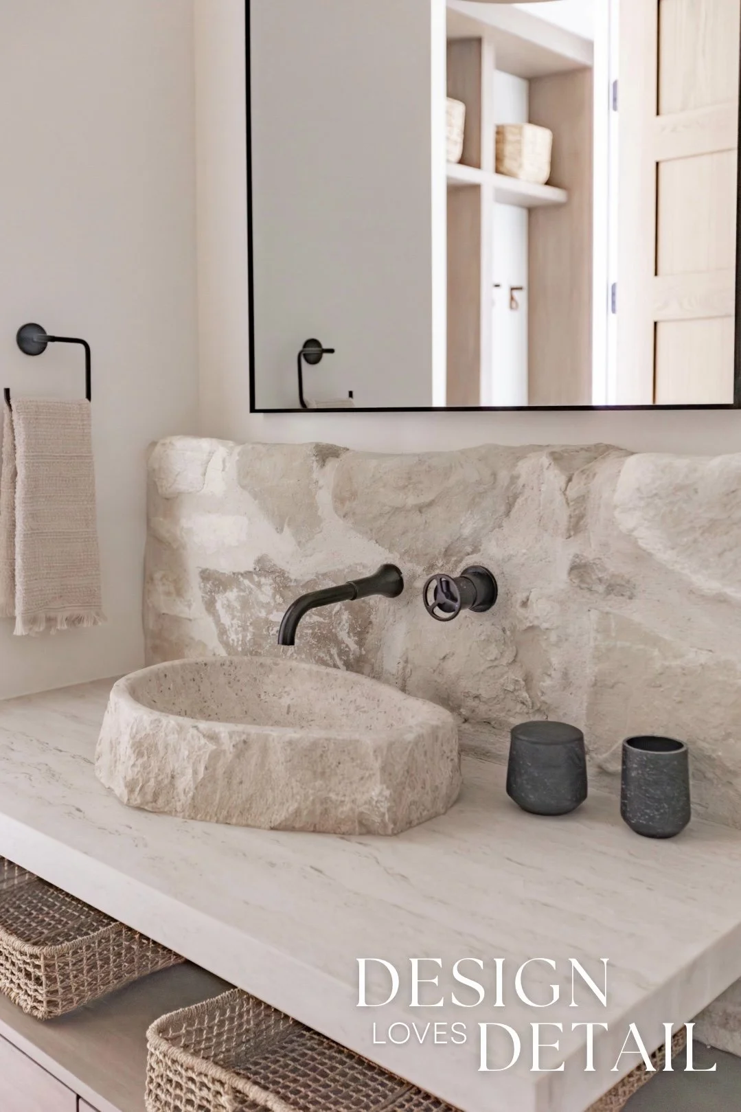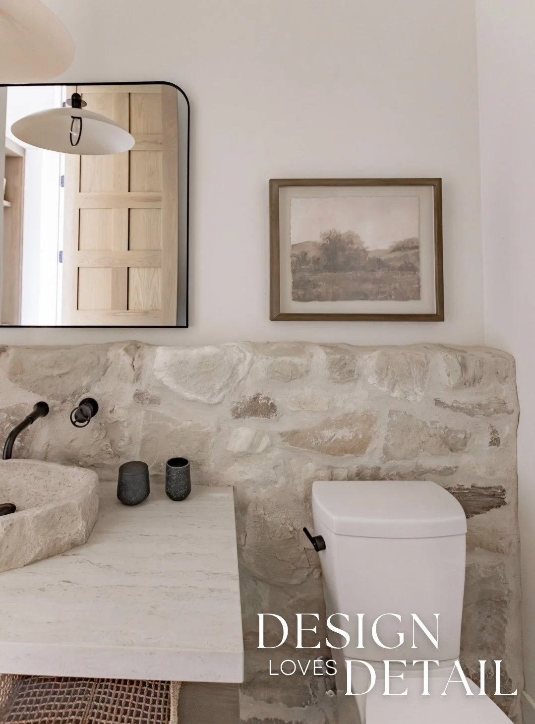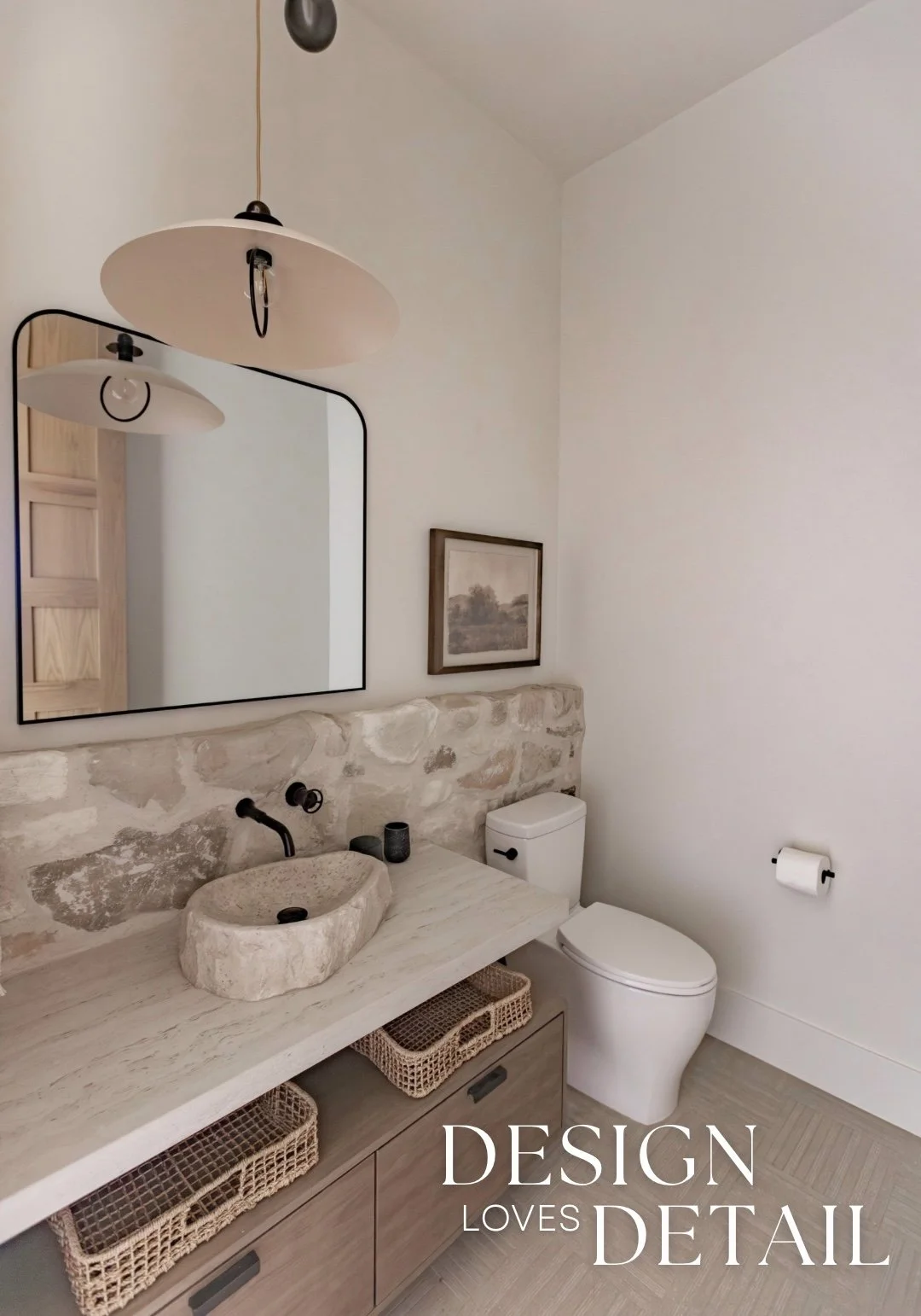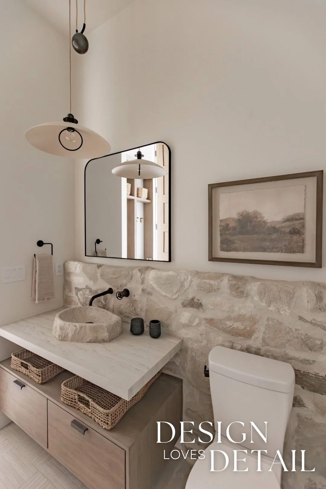 And seriously… how cute is the powder bath?! I adore it. It’s the perfect blend of European touches and ties in so well with the rest of the mudroom. I love the raw organic feel with the stone elements mixed with the clean lines of the faucet & mirror. Plus the light fixture adds lots of character too. The artwork is a Hobby Lobby find and I’ll link the other details for you to shop below!