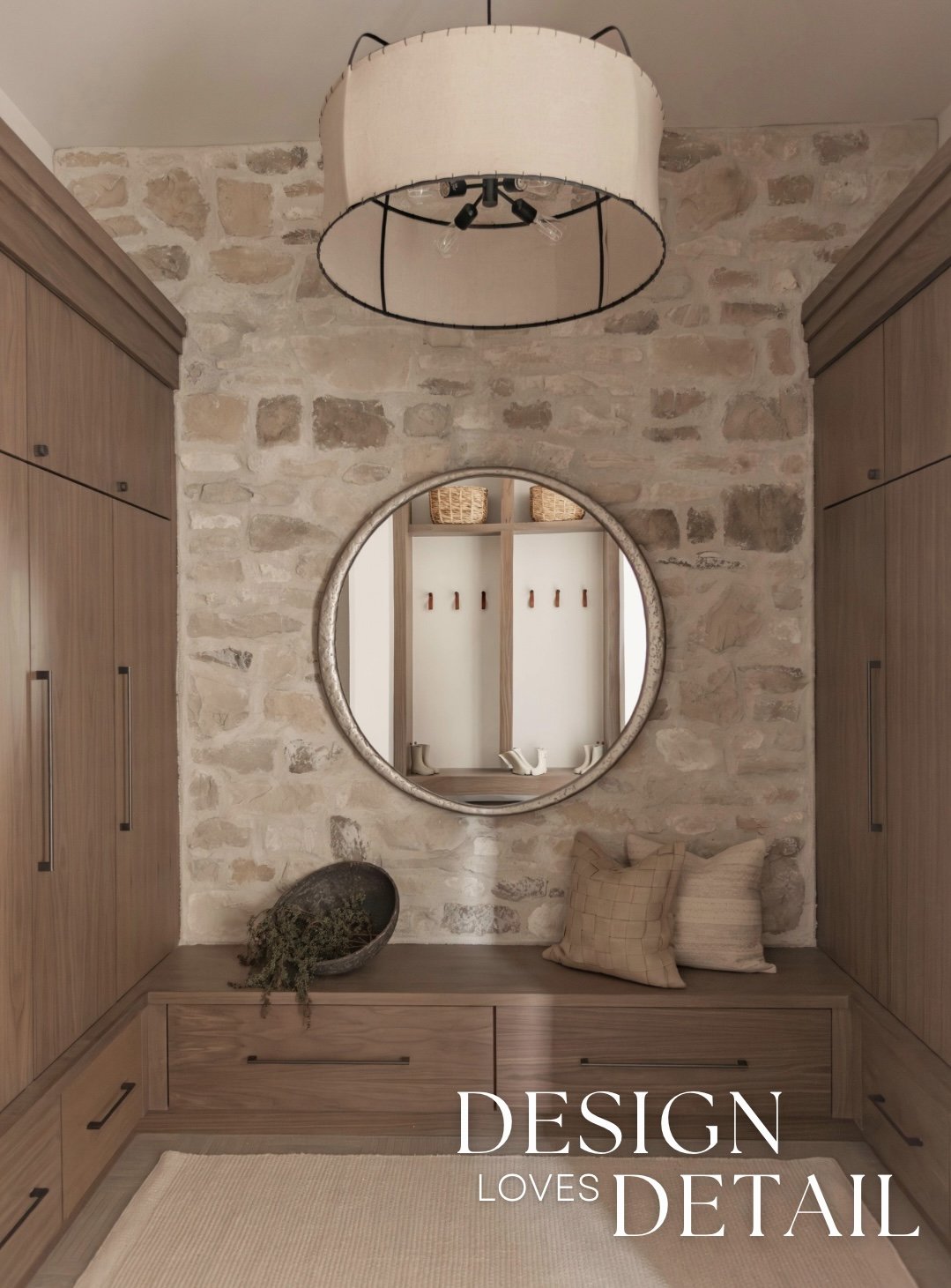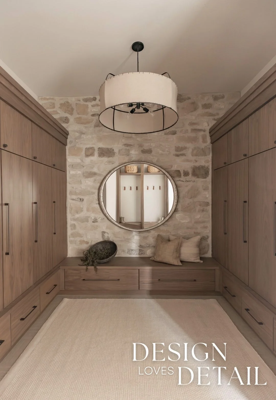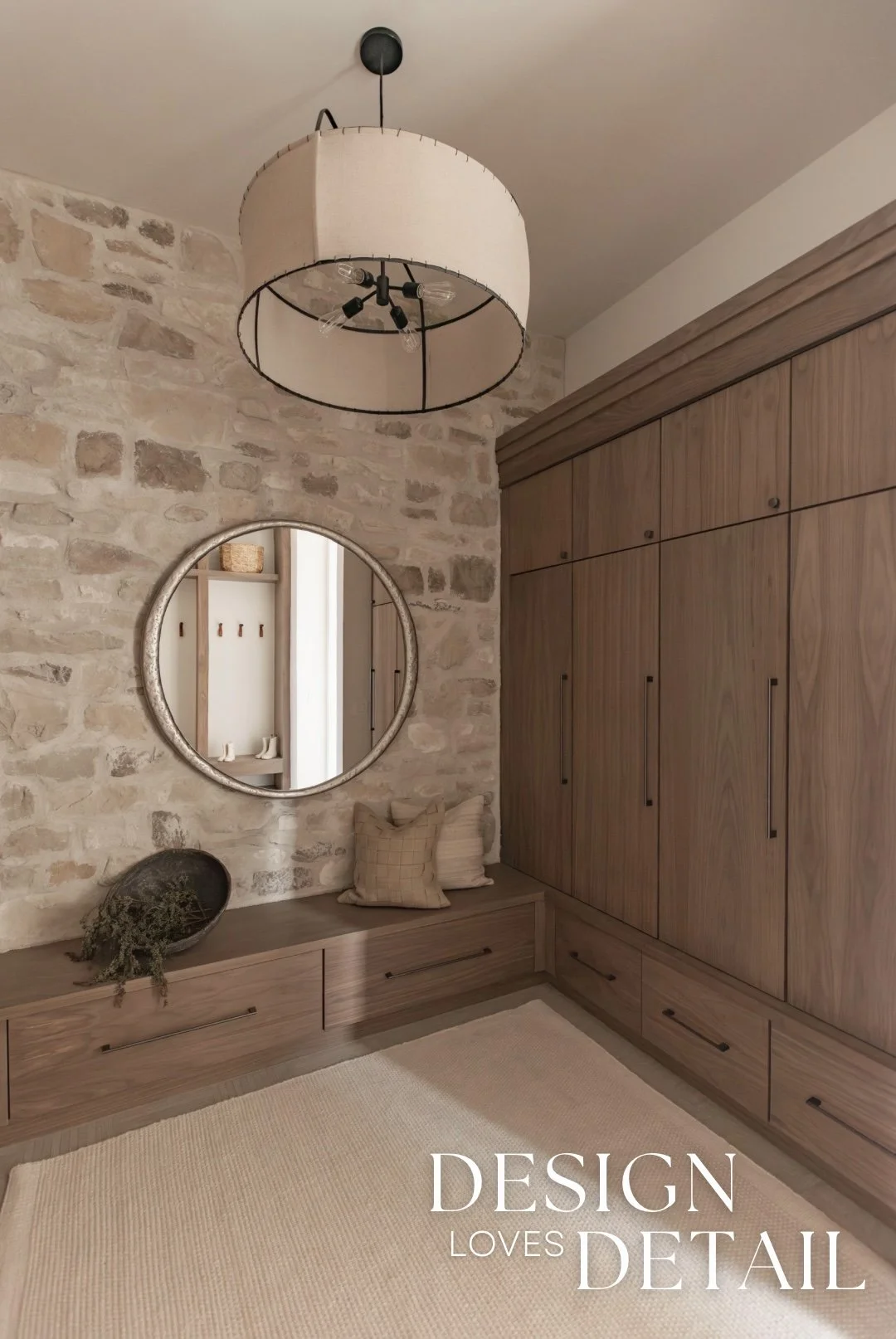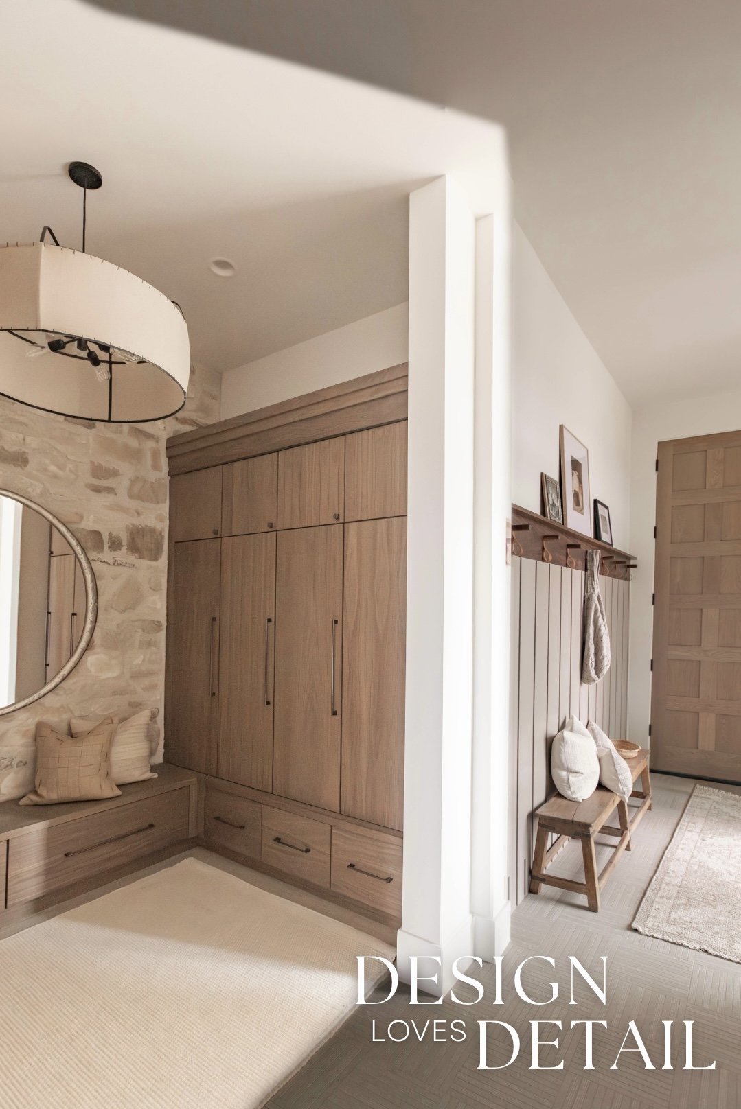 I absolutely love how much storage this mudroom offers too. Both open and closed storage, cabinetry, drawers & hooks— making it easy to find a place for everything and keep the clutter out of sight! The locker area is so spacious and we tied in the Milan Ridgestone for character and interest in both the bathroom and the storage area. I love having a mirror in the mudroom so you can check your appearance before heading out the door and it also reflects light into the hallway. Plus some bench areas for sitting down to get shoes on and off.