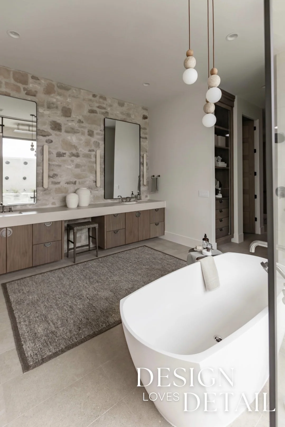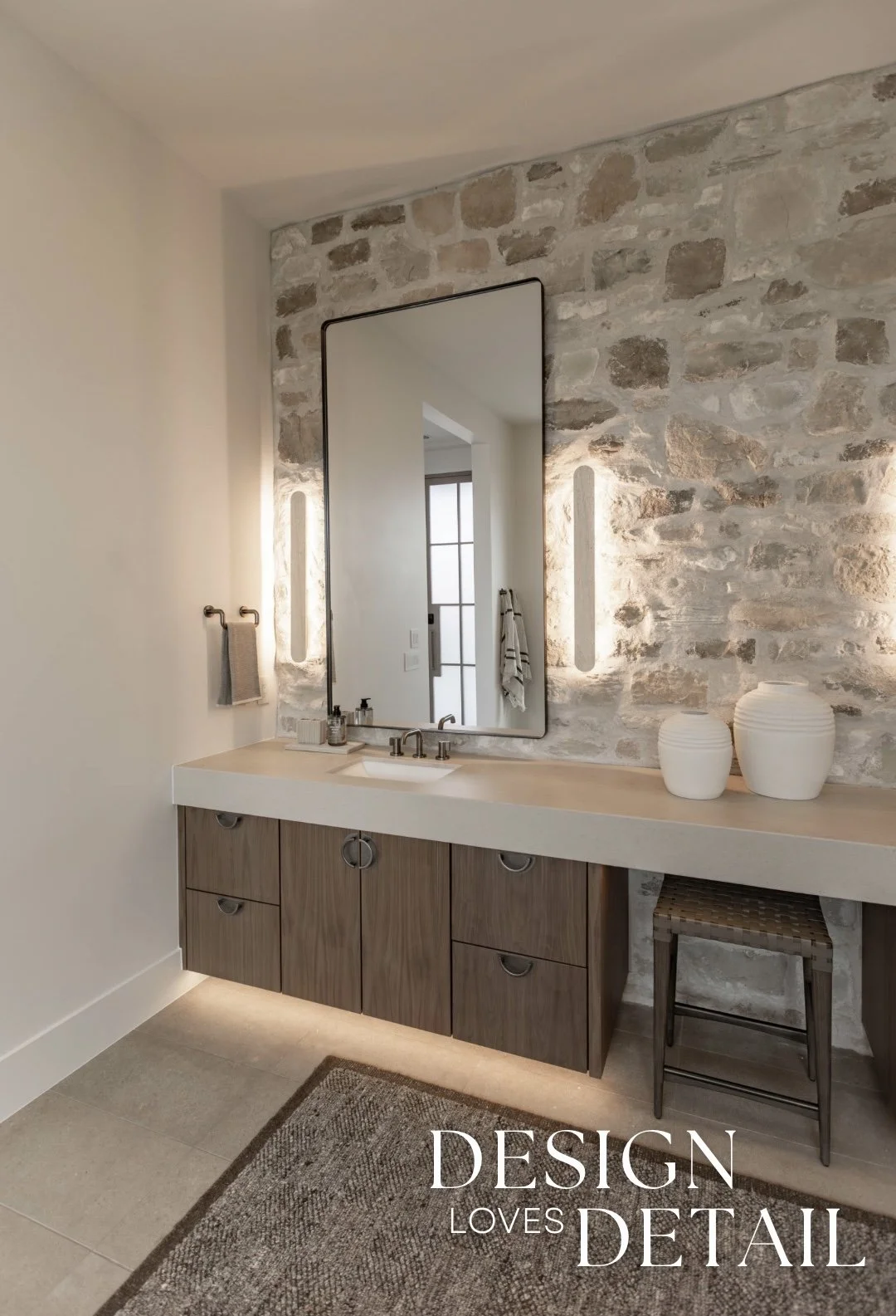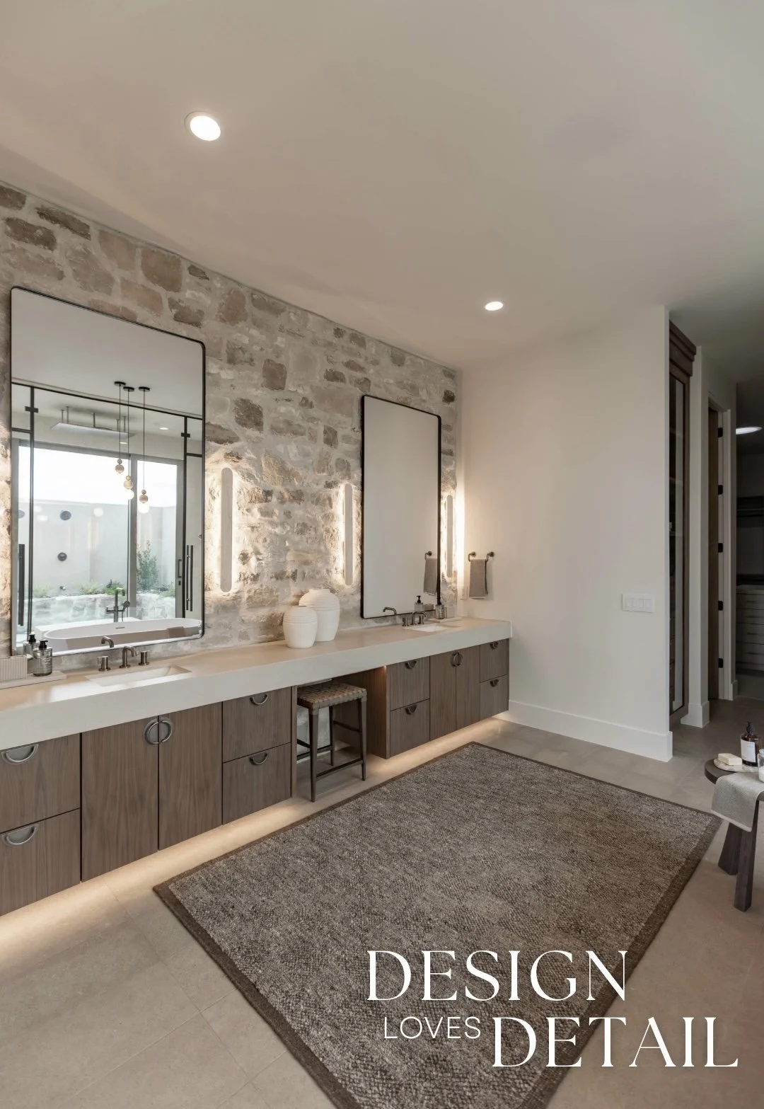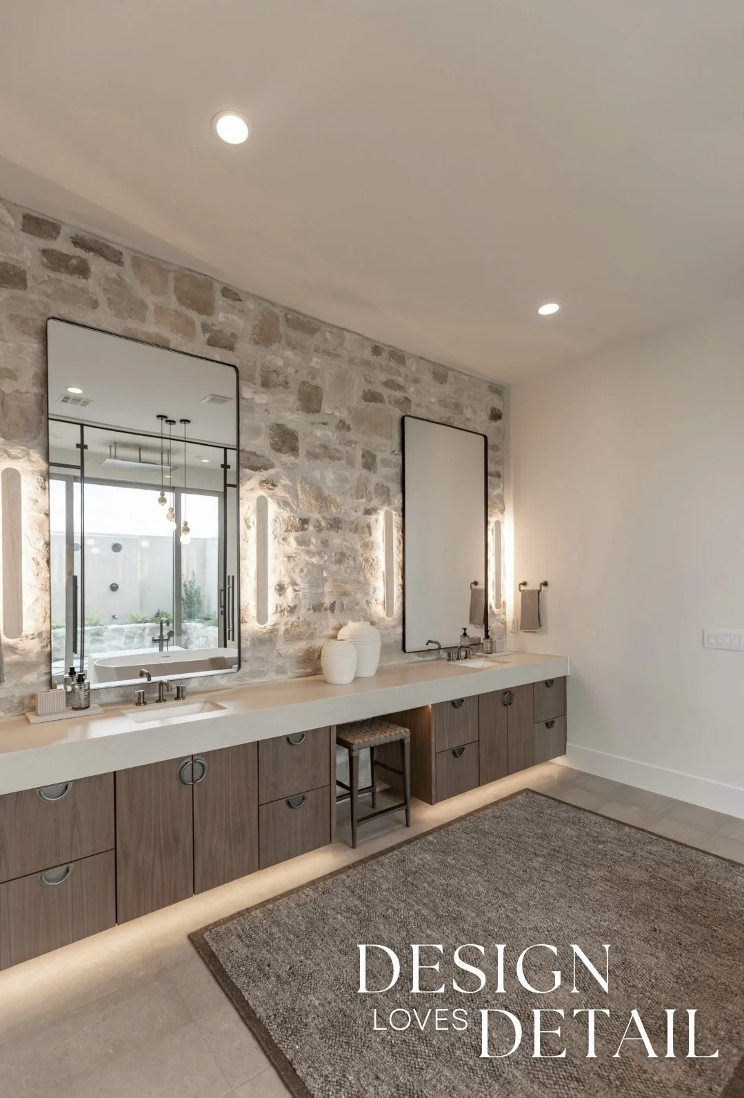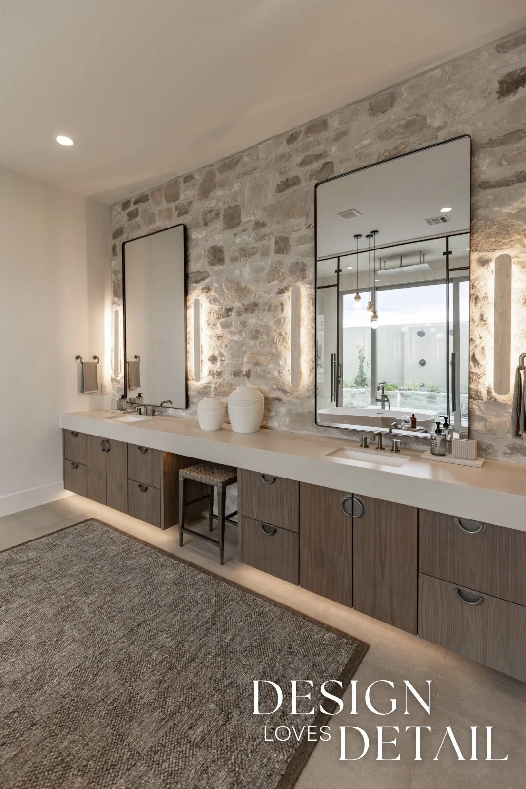 Another room tour from the Parade of Homes house that I worked on with RL Wyman Design + Create! Here’s a look at the primary bathroom, which I absolutely adore. The vanity wall was the perfect place to bring in some of the Milan Ridgestone— a touch of organic, raw texture to tie in with the exterior. It really gives this space some character, whilst also maintaining a minimalist approach. Keeping the other details simple— like the oversized (and surprisingly affordable!) vanity mirrors, allows the stone to really have its moment. Also the minimal travertine wall sconces are an understated element that offer a unique detail in the way they accent the face of the stone, subtly highlighting the texture.