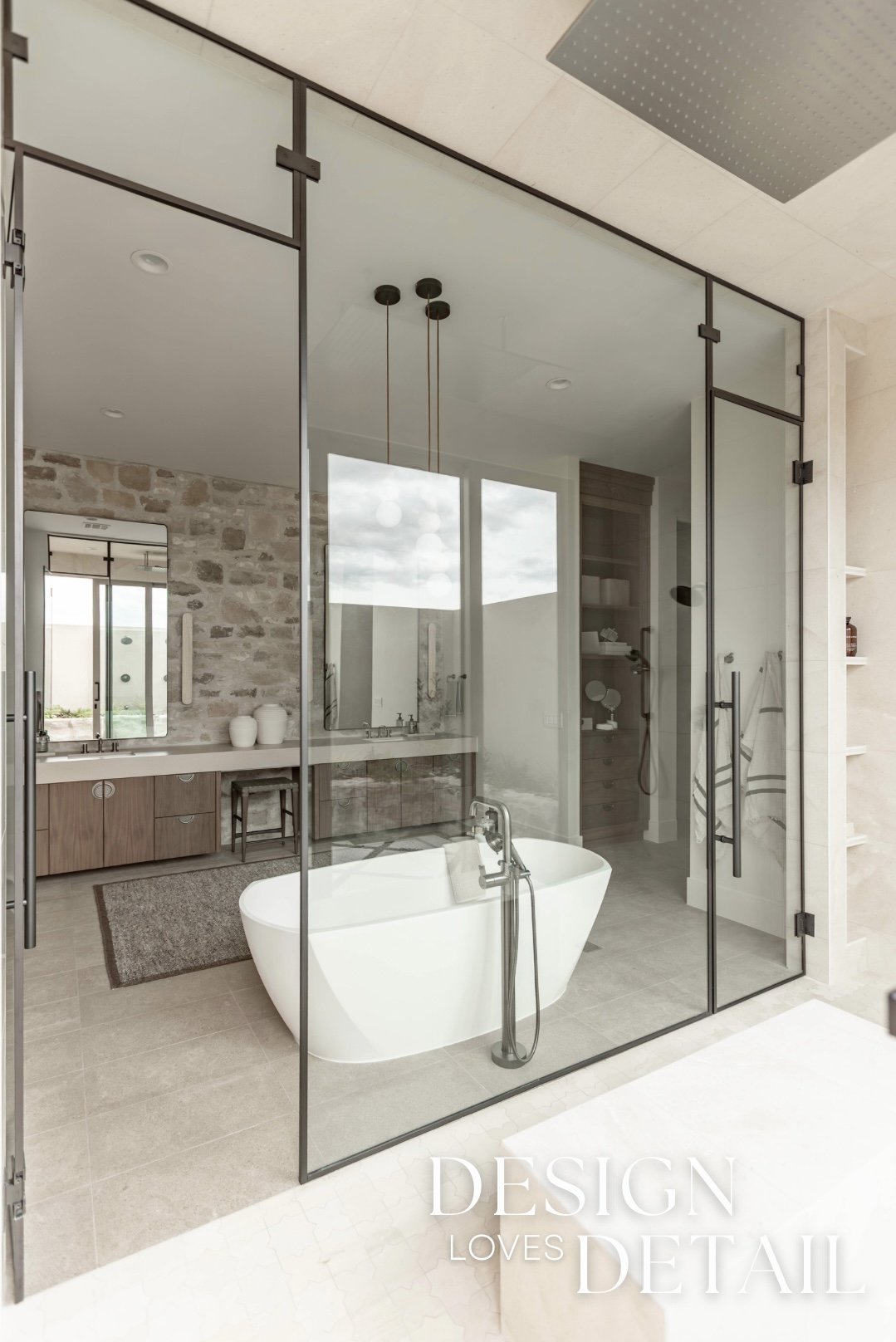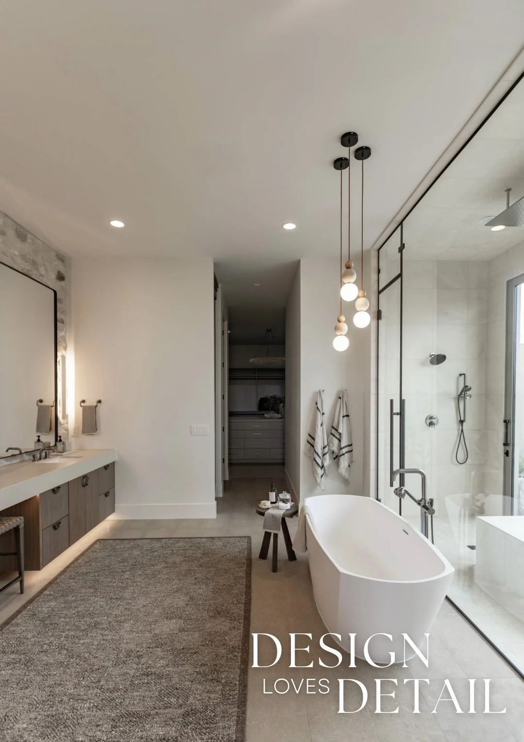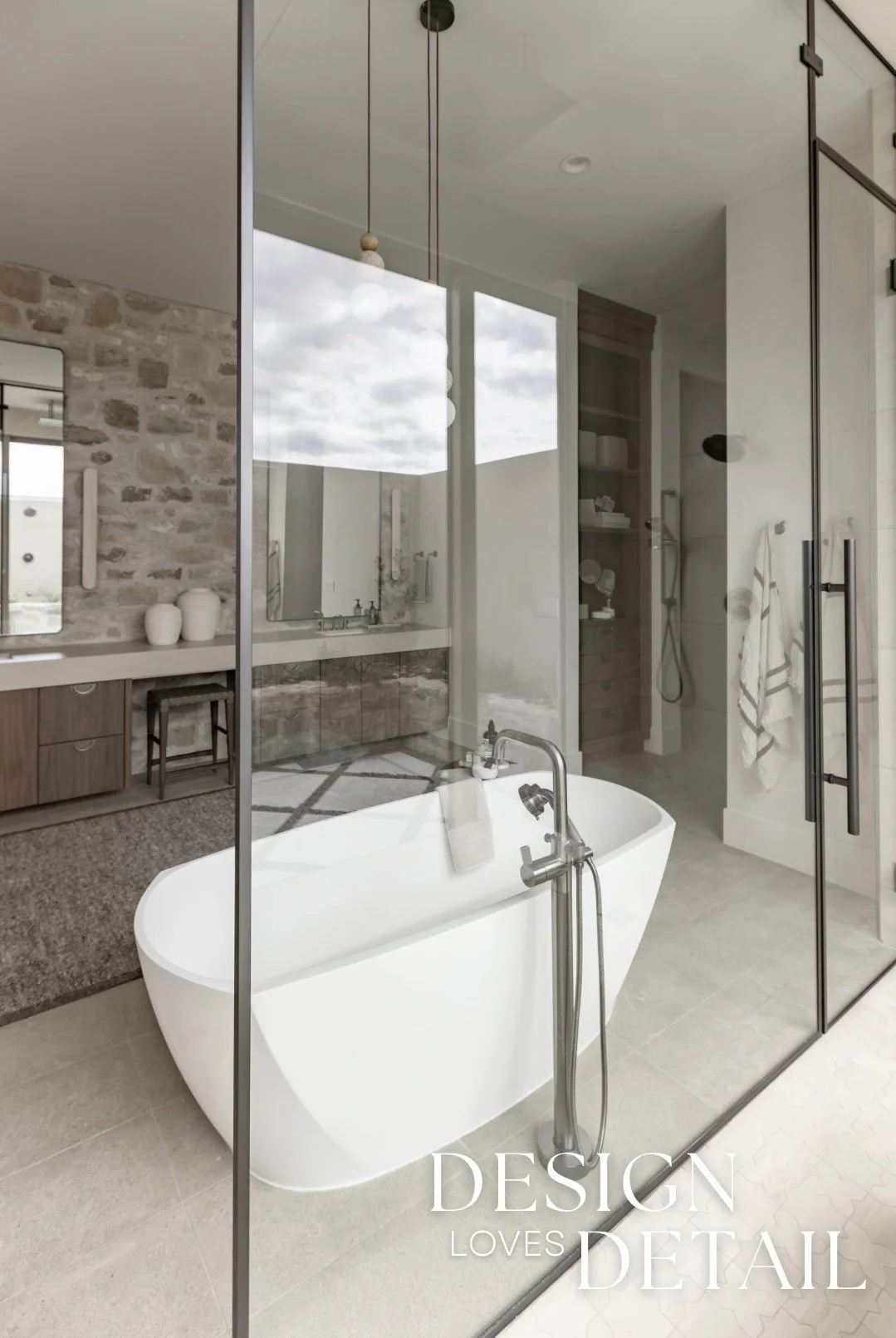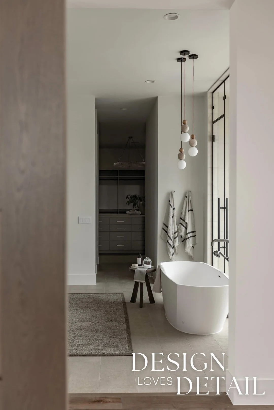 More well planned touches of luxury in this space include the heated stone floors, oversized bathtub, floating walnut vanities and stunning built-in linen cabinet. I can’t wait to show you more of this incredible project, both here & over on our YouTube channel too!