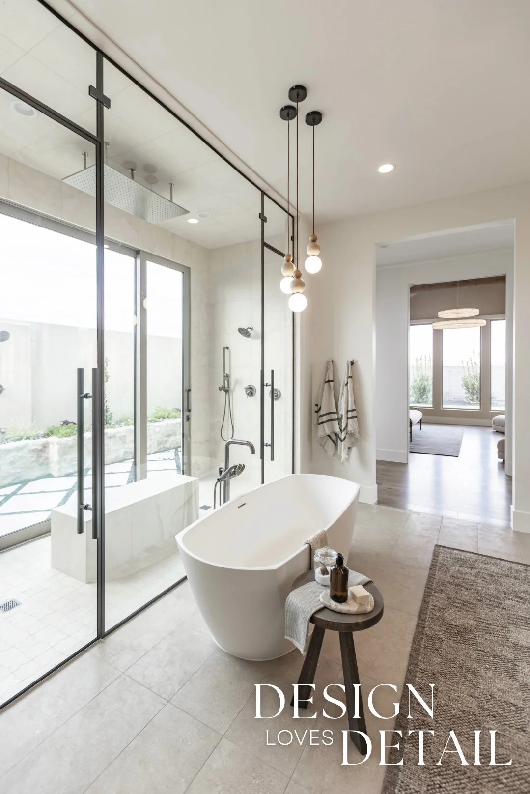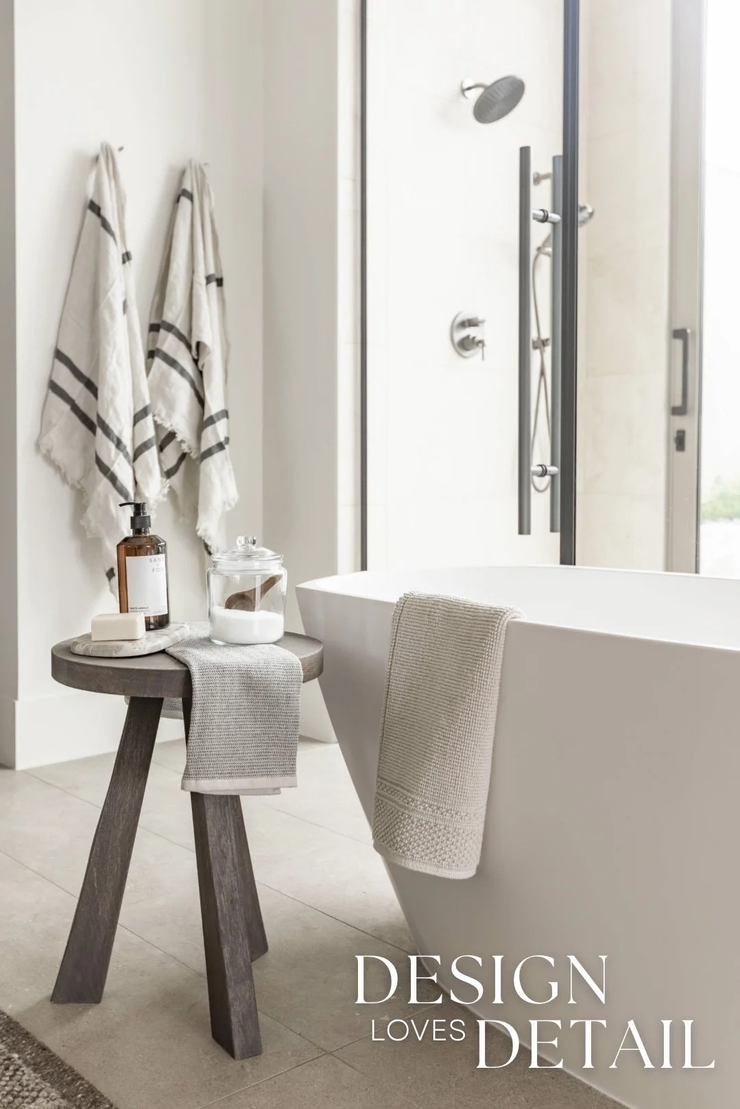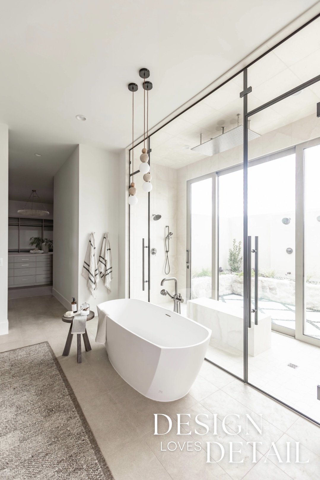 More well planned touches of luxury in this space include the heated stone floors, oversized bathtub, floating walnut vanities and stunning built-in linen cabinet. I can’t wait to show you more of this incredible project, both here & over on our YouTube channel too!
