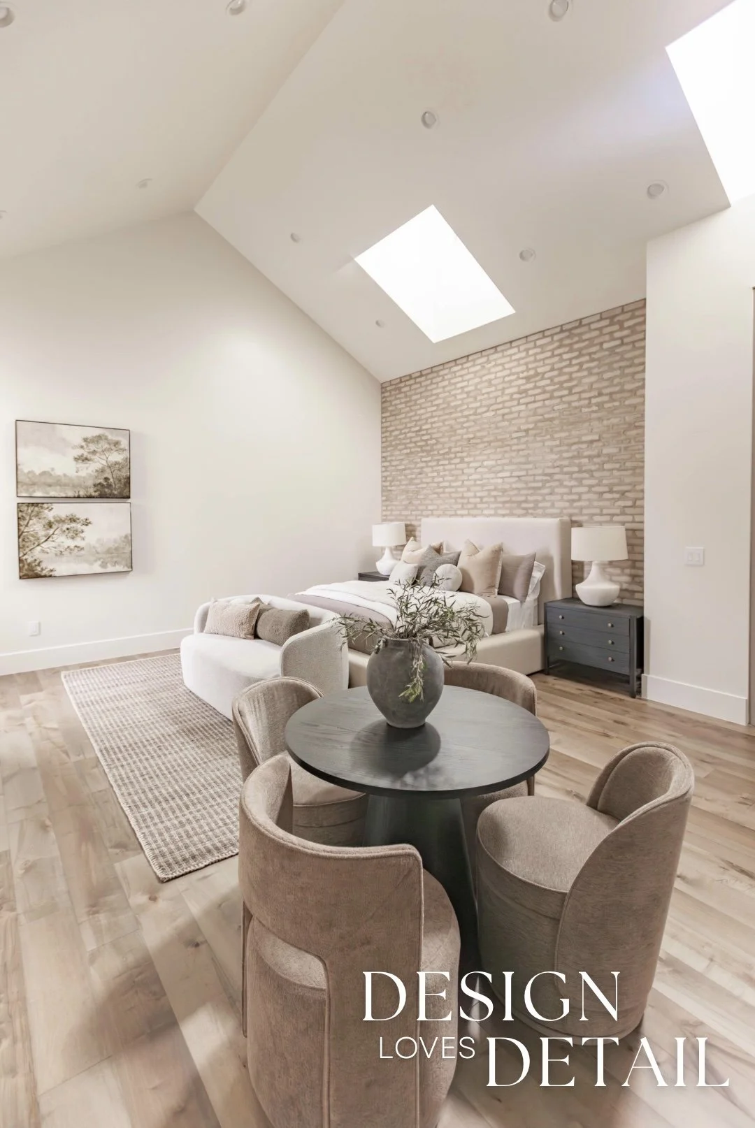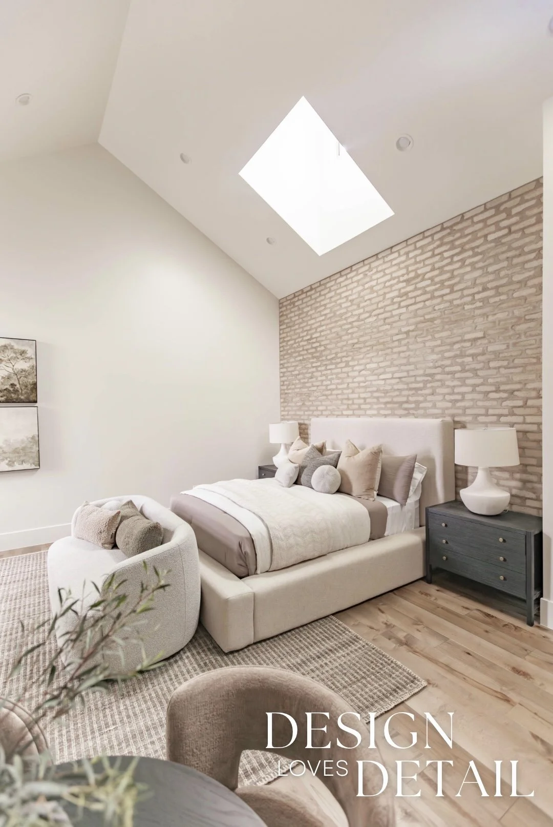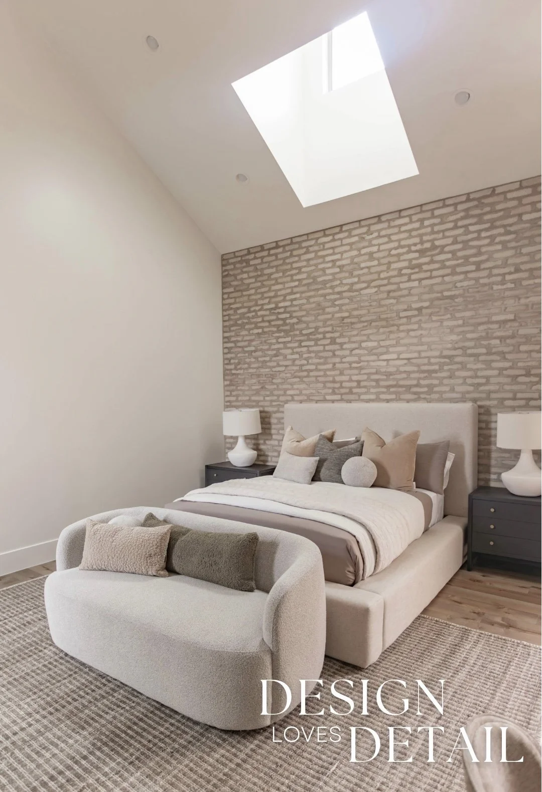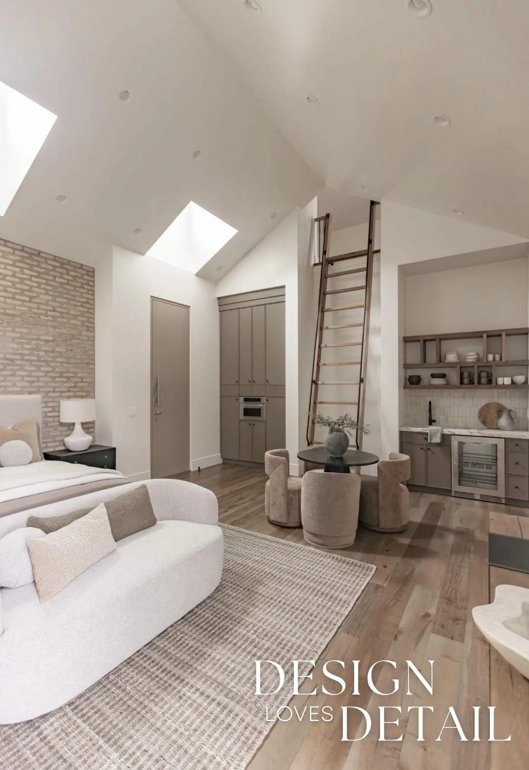 I love a good space conscious layout & this casita was such a fun part of the RL Wyman Parade House project I got to work on! The perfect place for your guests to stay in secluded luxury! I love the bunk loft with tall ship ladder crafted of walnut, the cute kitchen/dining area with creative open storage for dinnerware, the dreamy resort-style bathroom, the gorgeous brick wall that creates the perfect backdrop for the bed, the studio style set-up of the space and that we were even able to establish a sort of living room feel with the settee at end of the bed for tv watching!