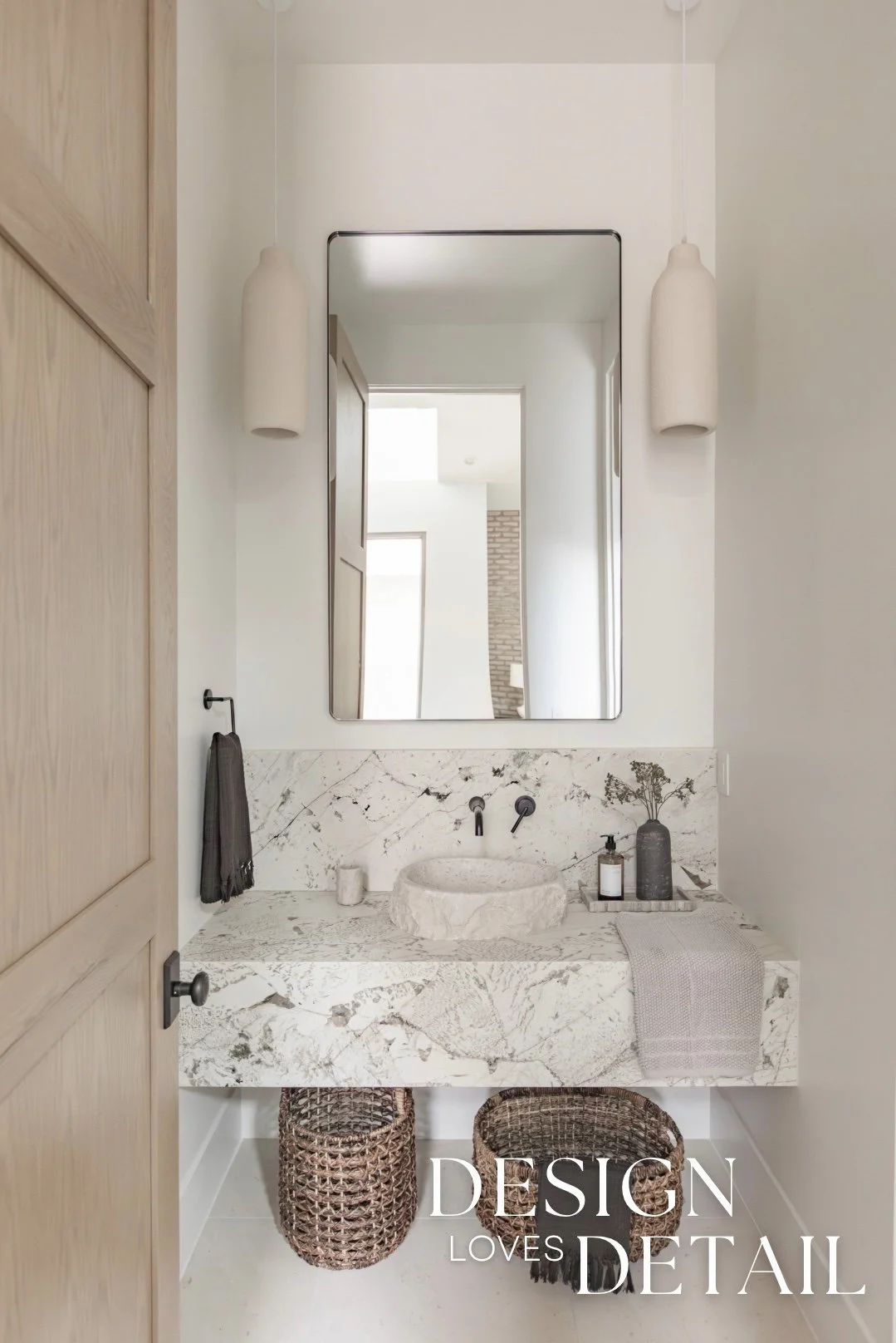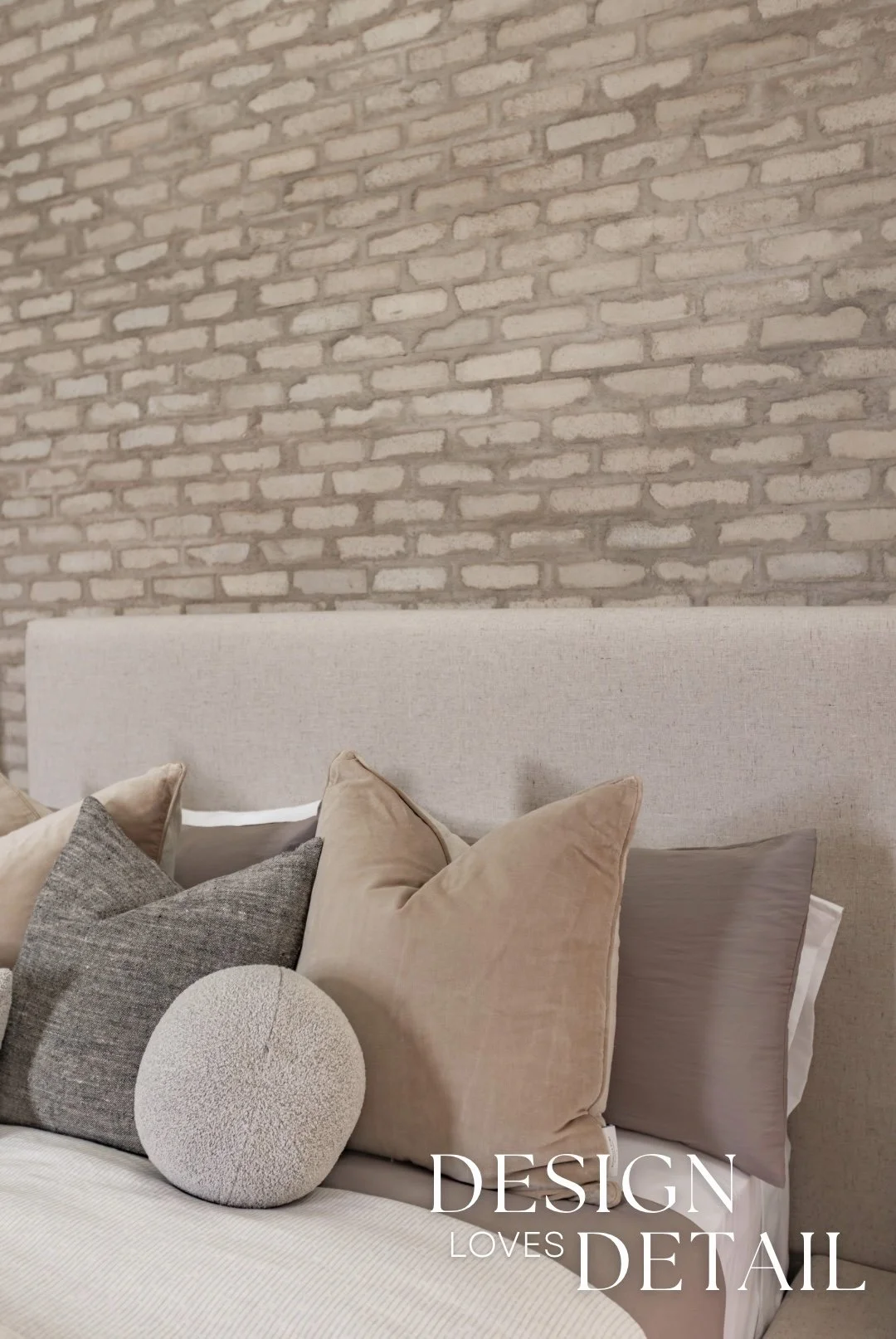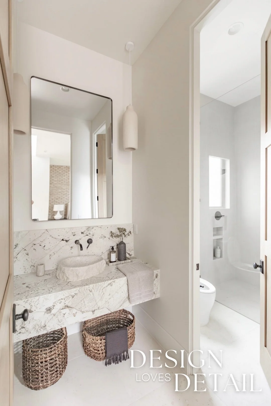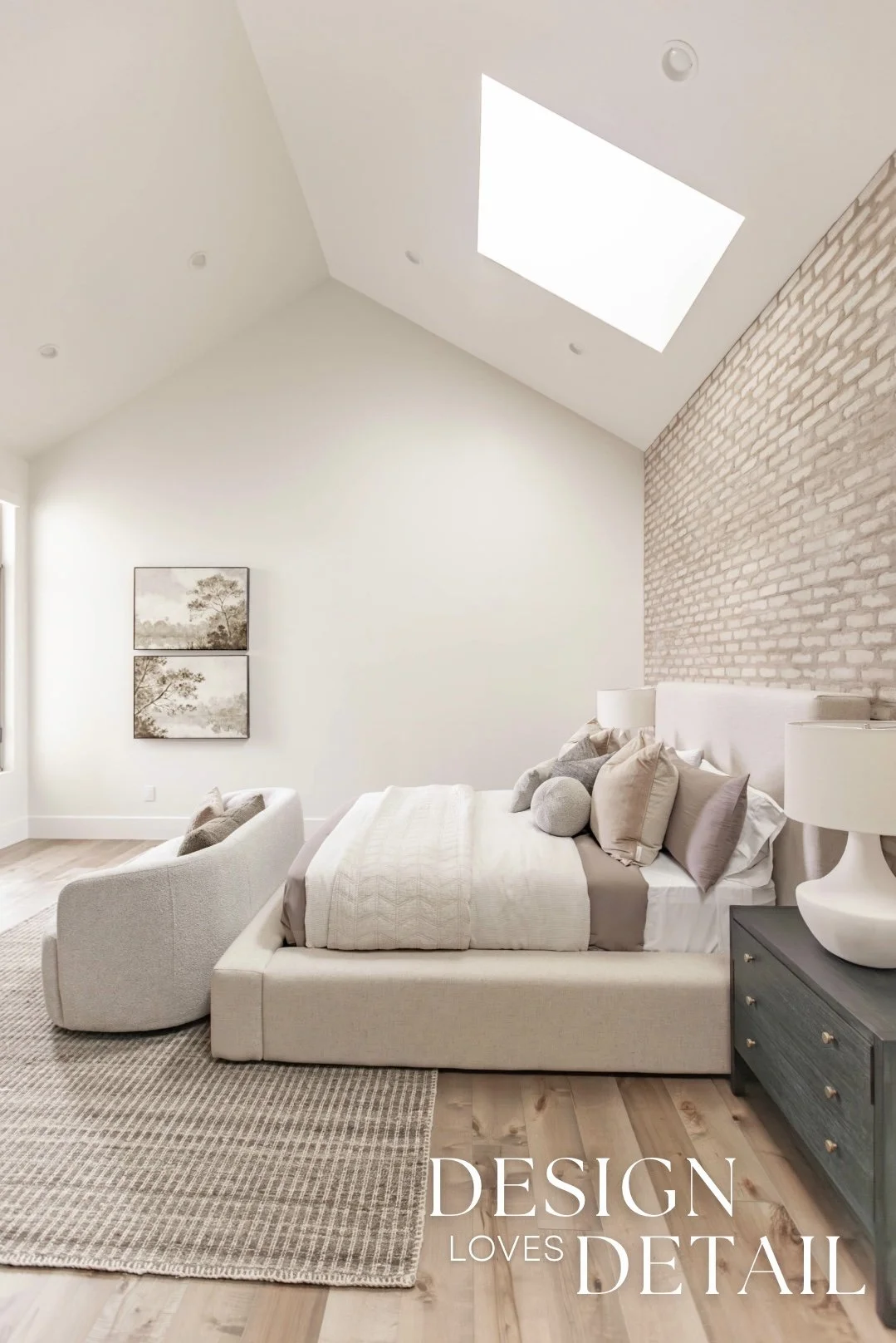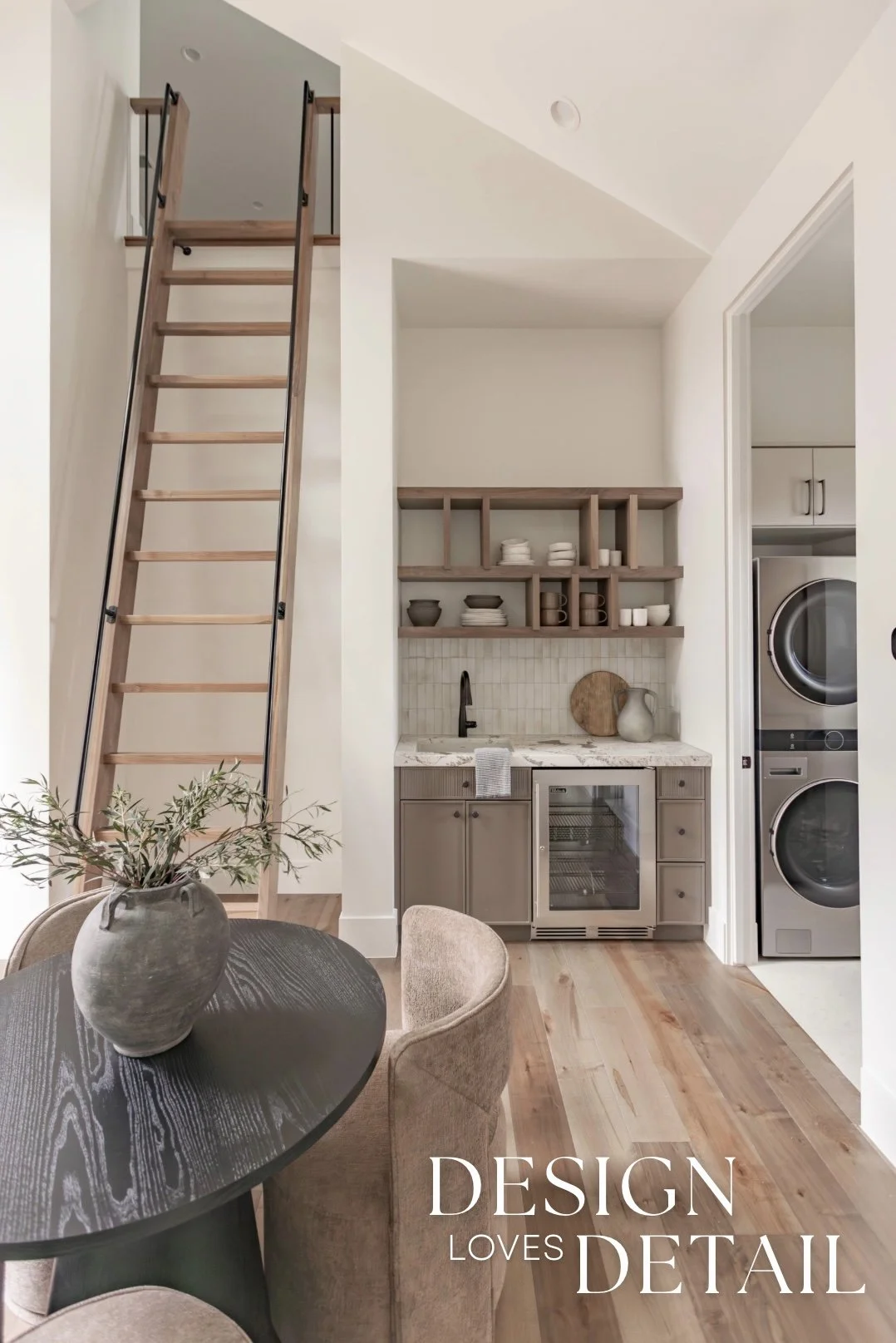 I love a good space conscious layout & this casita was such a fun part of the RL Wyman Parade House project I got to work on! The perfect place for your guests to stay in secluded luxury! I love the bunk loft with tall ship ladder crafted of walnut, the cute kitchen/dining area with creative open storage for dinnerware, the dreamy resort-style bathroom, the gorgeous brick wall that creates the perfect backdrop for the bed, the studio style set-up of the space and that we were even able to establish a sort of living room feel with the settee at end of the bed for tv watching!