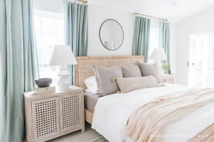 I've really loved that this room gets so much natural light. There are a couple windows, plus a glass sliding door that goes out the patio. I wanted to highlight the windows & make the wall with bed the focal point of the room, so I added some beautiful velvet drapery panels. I linked some similar ones below! I used my favorite simple curtain rod in the satin brass with coordinating curtain rings to provide a custom look without the expense.
