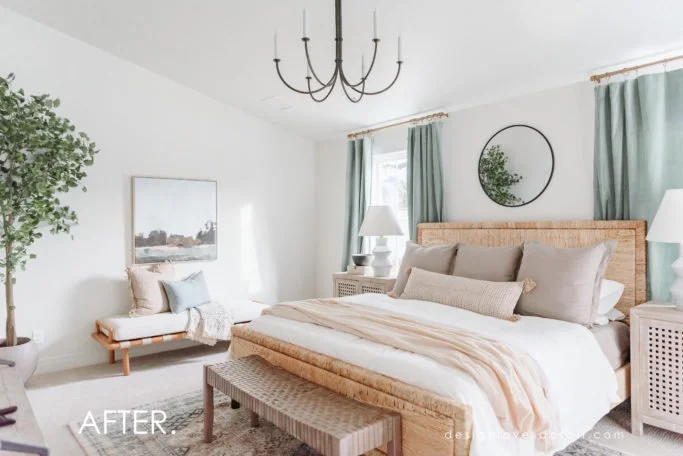 Another very important element for updating this space is the Generation Lighting Champlain chandelier. It's amazing. I love the blend of modern & classic detail it adds to the space and that it's simple look makes a statement without feeling too bulky. The curved arms add a classic detail while the Iron Oxide finish ties in well with the mirror over the bed and the modern sliding door. I'm sharing a full video tour of this space in my YouTube video linked below including tips on how to make a room feel balanced and how to add that higher end feel even when it's builder grade!