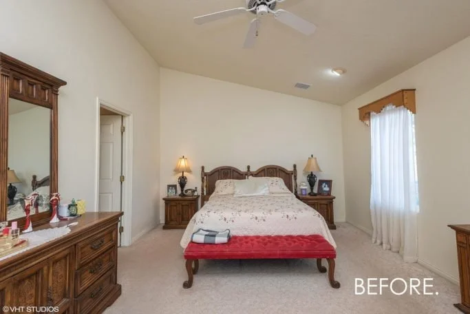 Originally this bedroom had allll the 90's vibes (see below)! The carpet was original to the home and was showing wear, the walls were a cream with yellowish undertone that felt a bit dingy. It's crazy what new carpet, paint, lighting & new furniture/layout can do! And I also added in a few pics that show the modern frosted glass door we just got installed as well-- I LOVE it! It really elevated the space and adds more function and high end style. It's a great value too because it comes with the custom looking door as well as the track and everything needed to install!