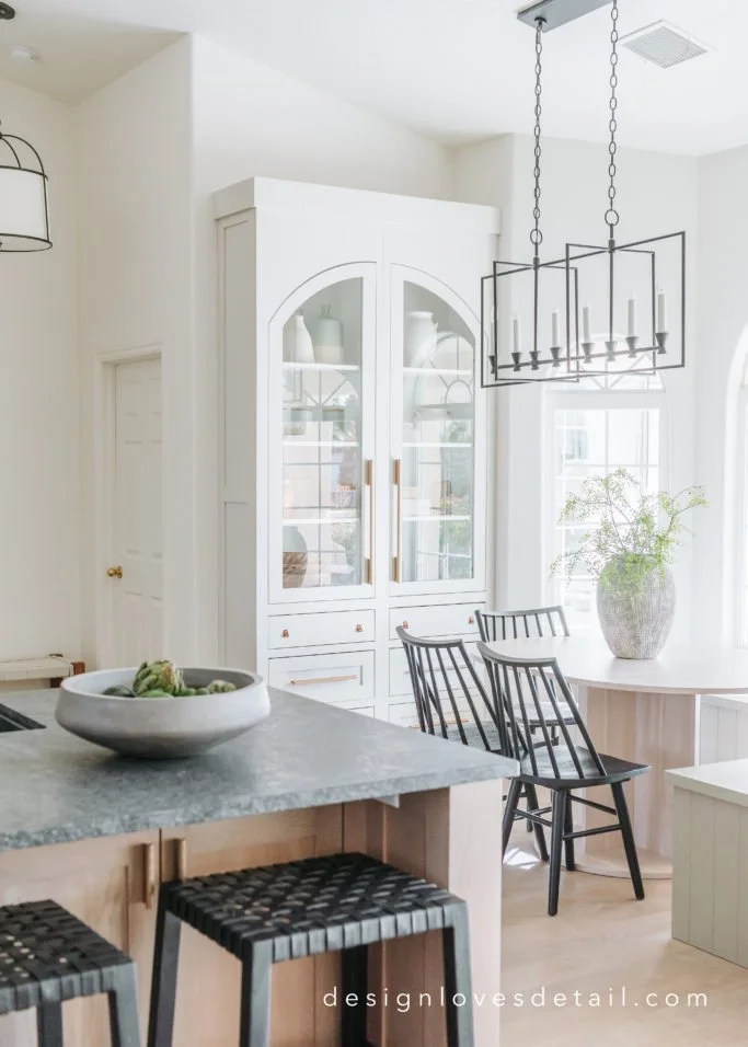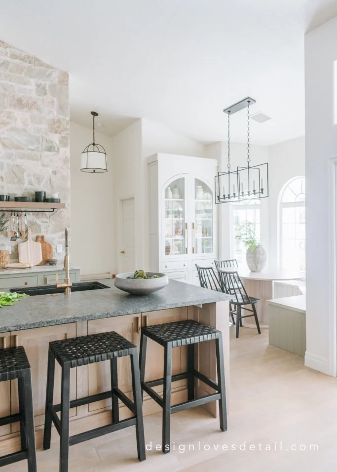 Though I've mixed pops of black throughout the space-- with the seating, dishes, light fixtures & bars for hanging pots, I also wanted to keep a balance with other metals as well. I love the copper tones of the cookware and the brushed brass details in the faucet & hardware! The incredible satin brass knurled texture cabinet pulls are from Schaub-- a sister company of Emtek! They're a great detail to add sophistication and warmth to the cabinetry. I also partnered with Schaub on this space as I love how their hardware delivers both top style + top quality.