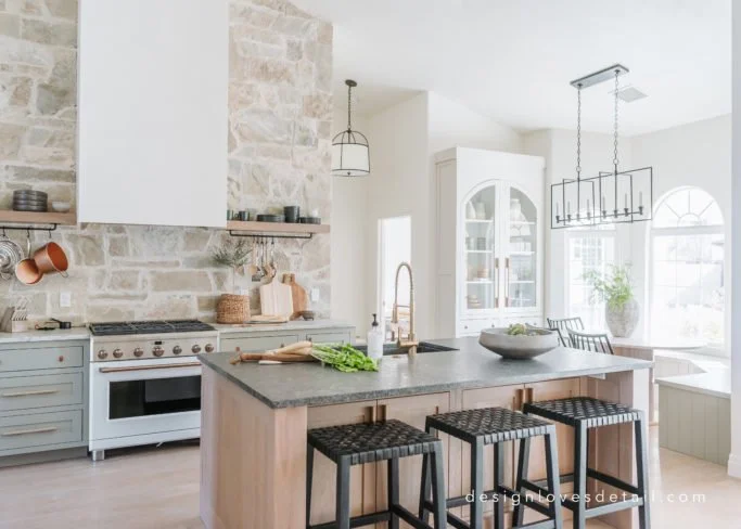 There's some element of utility and function that comes to mind when I think of that old-world European style. The spaces were often smaller so more priority was given to utilizing each inch of space. Having pots & pans easy to reach would be essential! There's something so charming about this utilitarian approach. I opted for open shelves to keep the stone the central focus of this room & decided the pot racks with hooks would bring that practical, charming detail to this space. Typically these types of racks are mounted to the wall, but I got a little creative and instead, attached them to the bottom of the shelves-- which I've loved! They're such a cool addition to any kitchen space and so affordable too. I got a set of 2 for around $50, hooks included!